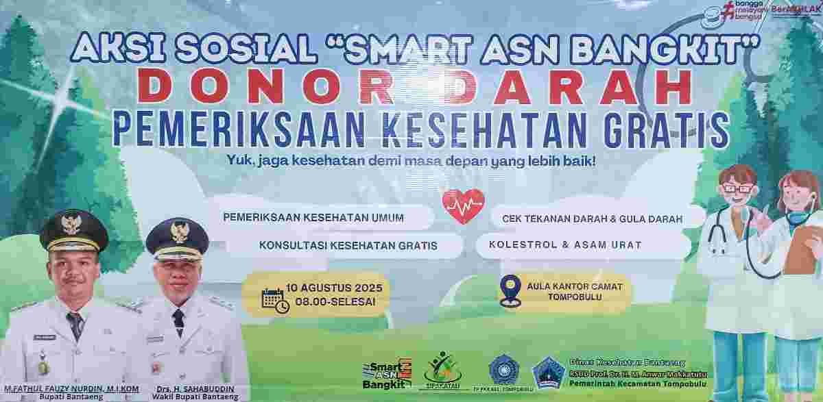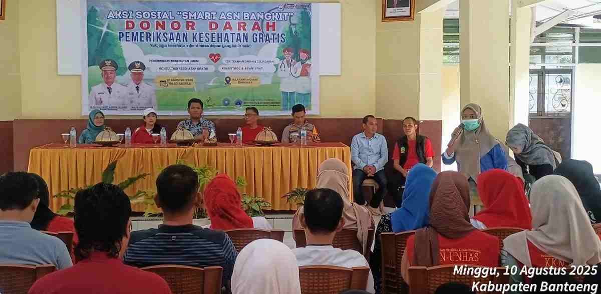 Bantaeng – Pemerintah Kecamatan Tompobulu bekerja sama dengan Dinas Kesehatan, UTDRS Anwar Makkatutu dan Mahasiswa(i) Profesi Kesehatan Universitas Hasanuddin Angkatan 67, menggelar kegiatan aksi sosial bertajuk “Smart ASN Bangkit” di Aula Kantor Kecamatan Tompobulu. Minggu, (10 Agustus 2025).