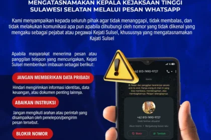 SULSEL | JejakKasusNews – Kejaksaan Tinggi Sulawesi Selatan (Kejati Sulsel) mengeluarkan peringatan resmi menyusul maraknya upaya penipuan yang mencatut nama pimpinan Kejaksaan Tinggi Sulawesi S...