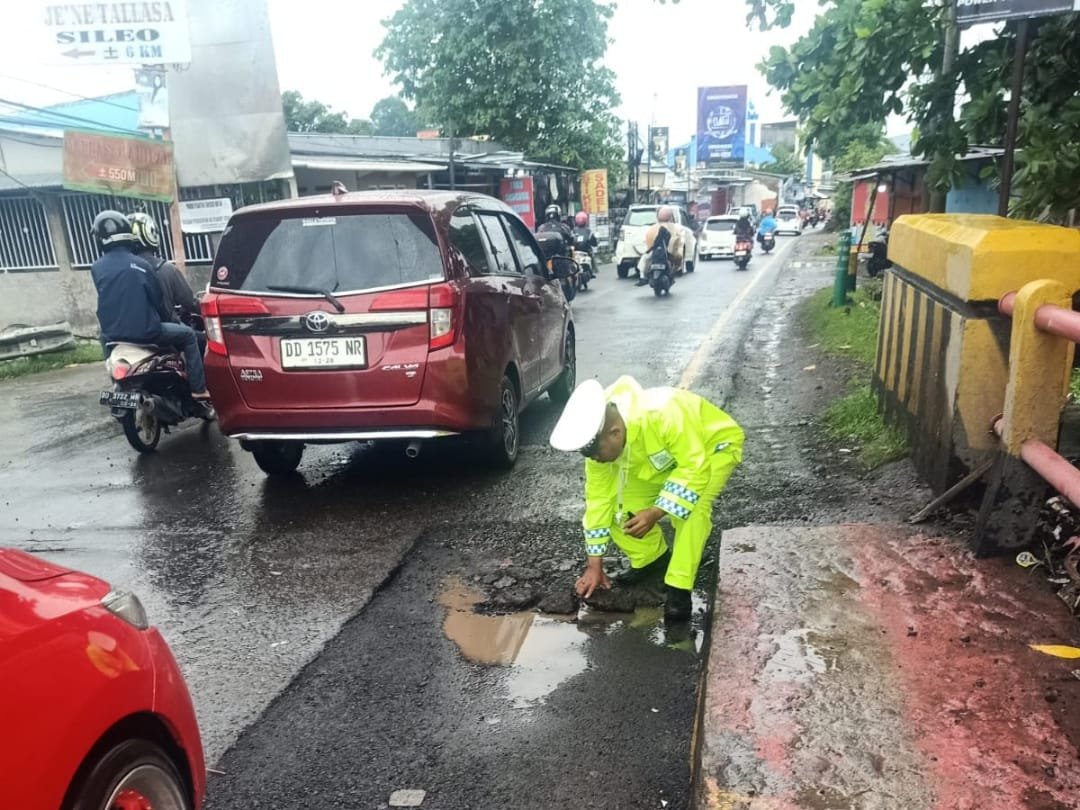 GOWA | JKN.ID – Salah satu personel Sat Lantas Polres Gowa, Bripka Arsil menutup jalan yang berlubang dengan material batu, di Jalan Poros Sungguminasa tepatnya di Jembatan kembar atau je’...