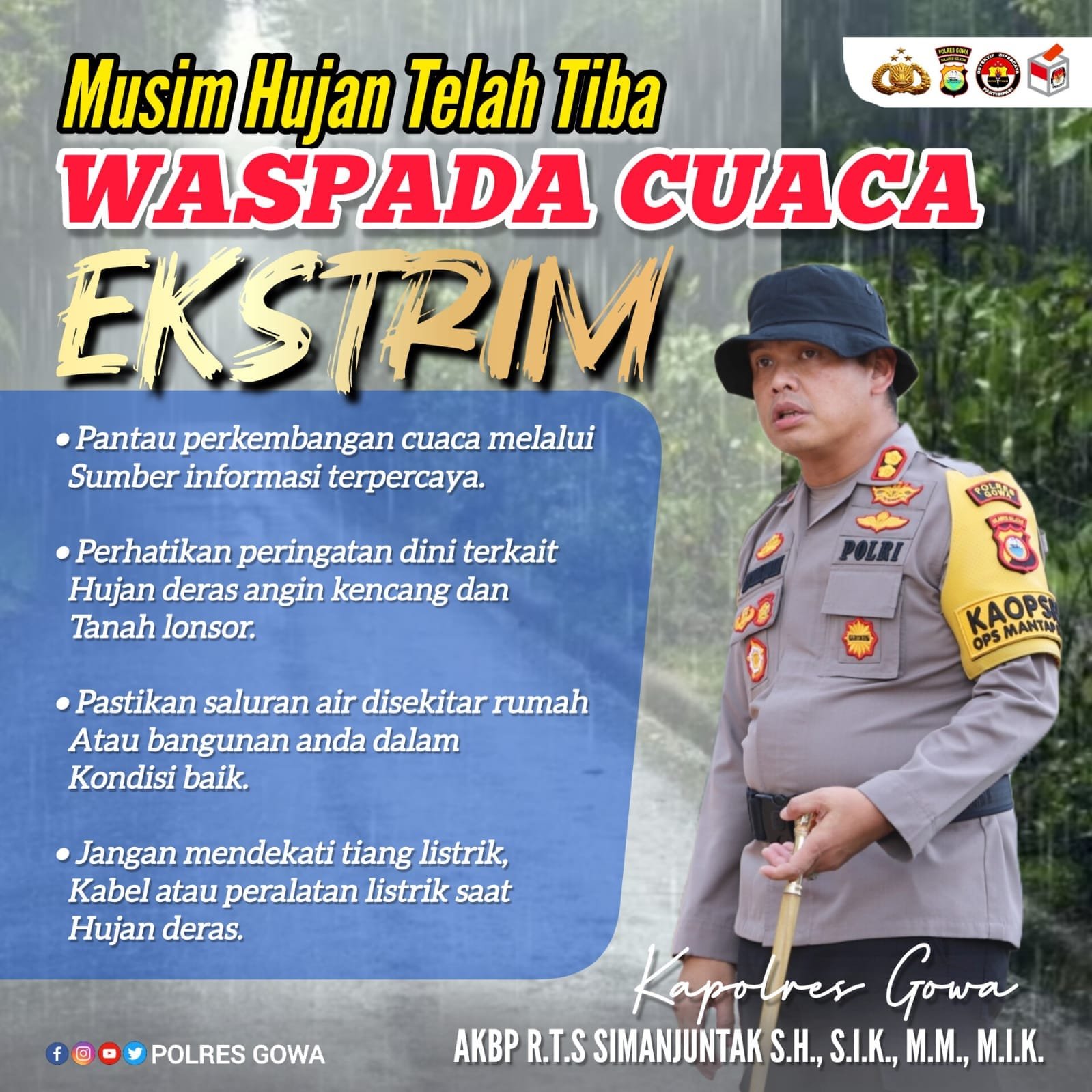 GOWA | JKN.ID – Menghadapi musim hujan yang telah tiba, Kapolres Gowa AKBP R.T.S Simanjuntak, S.H., S.I.K., M.M., M.I.K., mengingatkan masyarakat untuk tetap waspada terhadap cuaca ekstrem yang ...