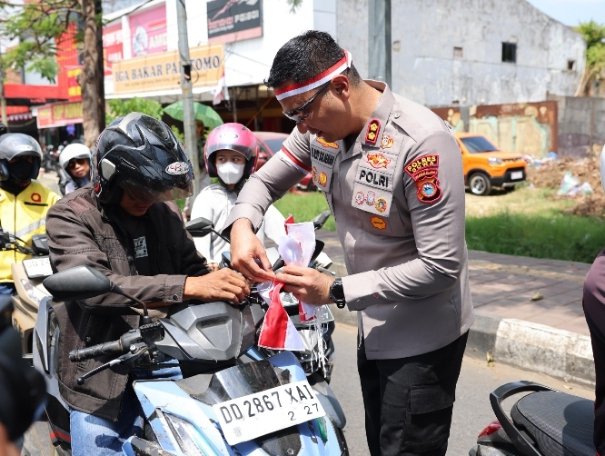 Kapolres Gowa Bagikan Bendera Merah Putih di Perbatasan Gowa – Makassar, Ajak Meriahkan HUT RI ke-80