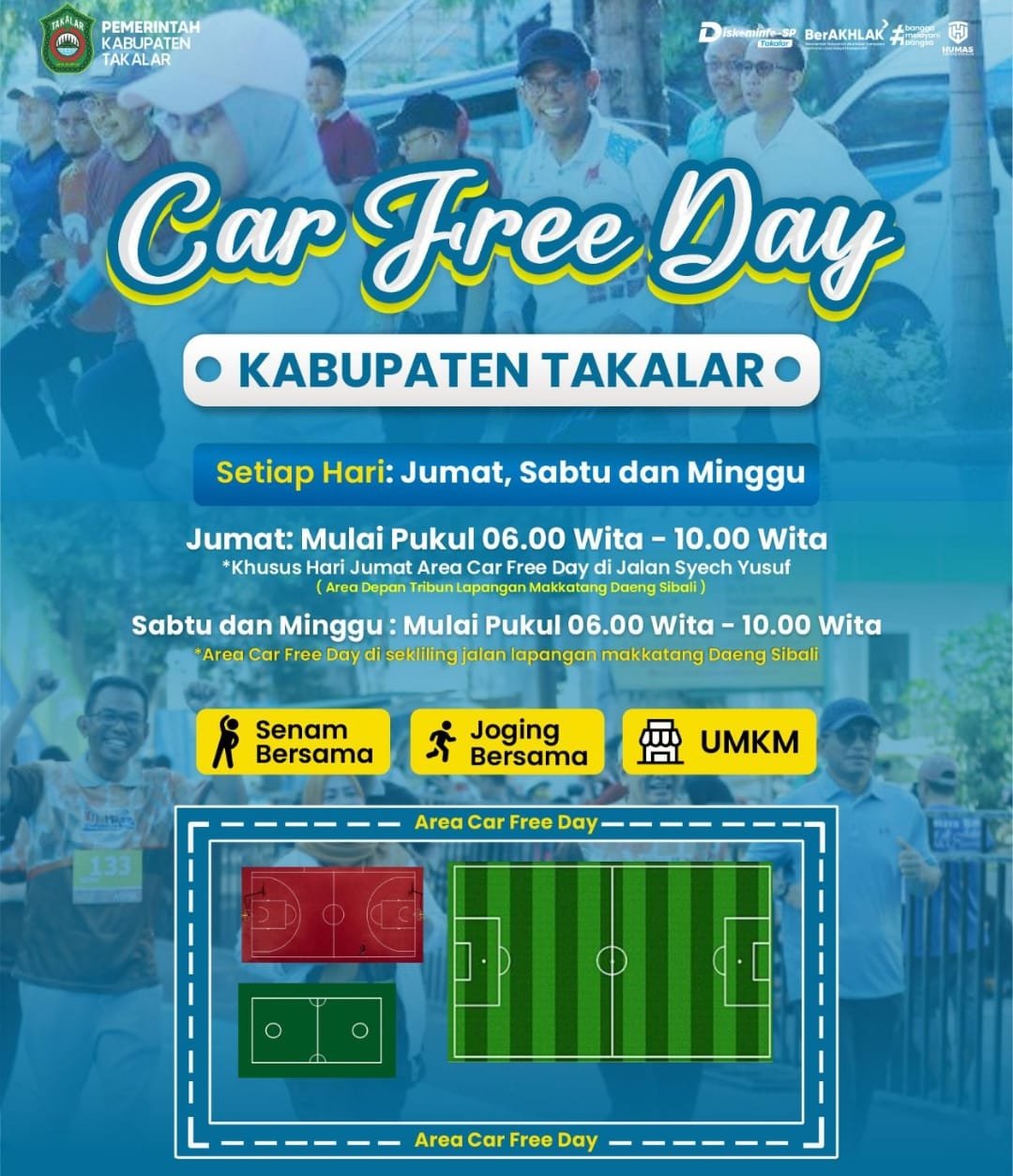 Pj. Bupati Takalar Dr. Setiawan Aswad,.M.Dev,.Plg mengatakan bahwa car free day dilaksanakan seiring dengan penataan ruang publik hijau dan sehat yang setahun ini telah dilakukan di Alun-Alun Kota Takalar dan di sekitar lapangan Makkatang Dg Sibali yang telah dilaunching pada bulan Agustus lalu sebagai pusat olahraga, kuliner dan kegiatan-kegiatan sosial/publik.