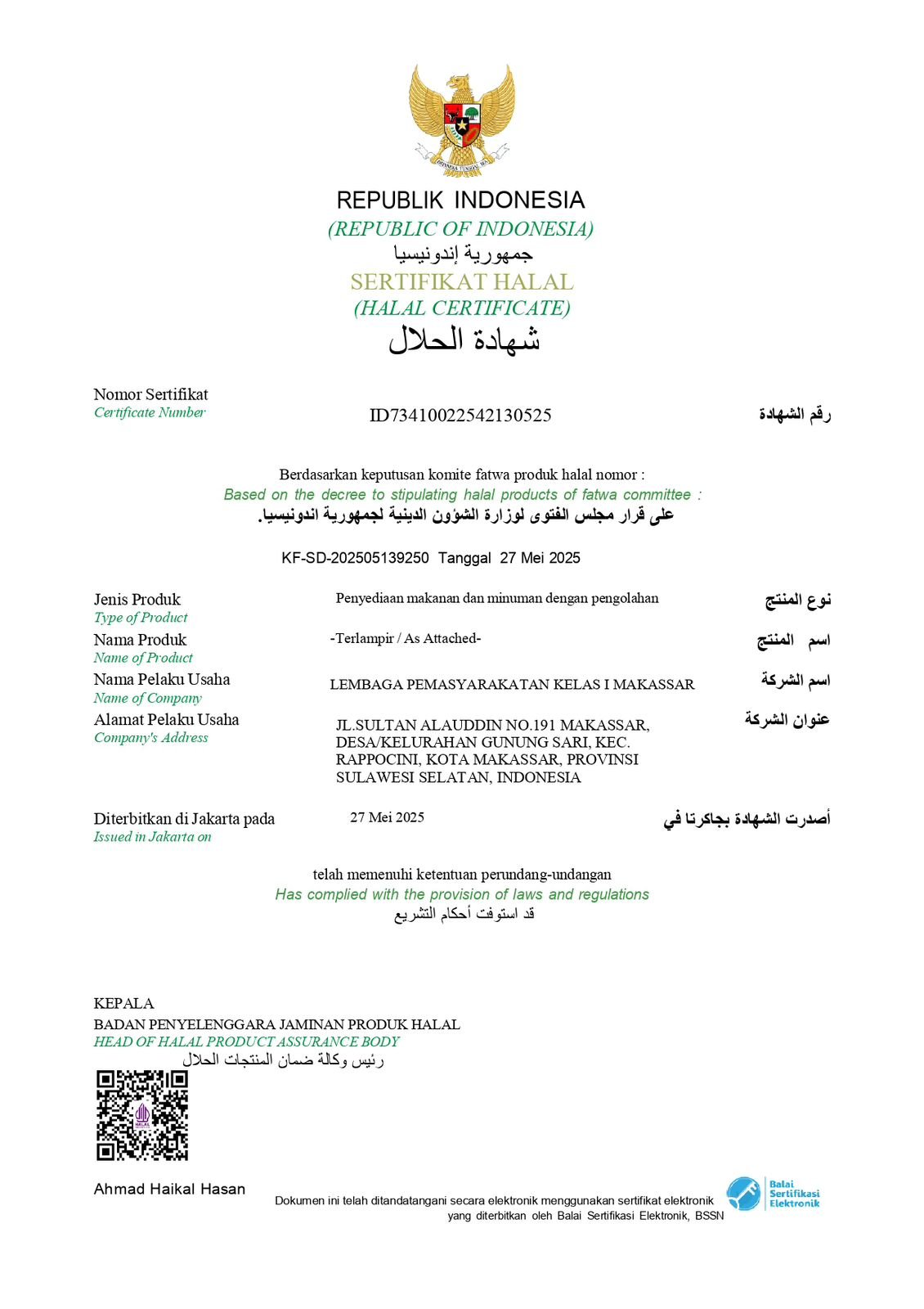 Dengan diperolehnya sertifikat halal ini, Lapas Makassar meningkatkan kepercayaan publik terhadap kualitas layanan yang diberikan, sekaligus menjadi contoh bagi Lapas lainnya dalam memenuhi standar yang ditetapkan dalam penyelenggaraan makanan.(Hms)