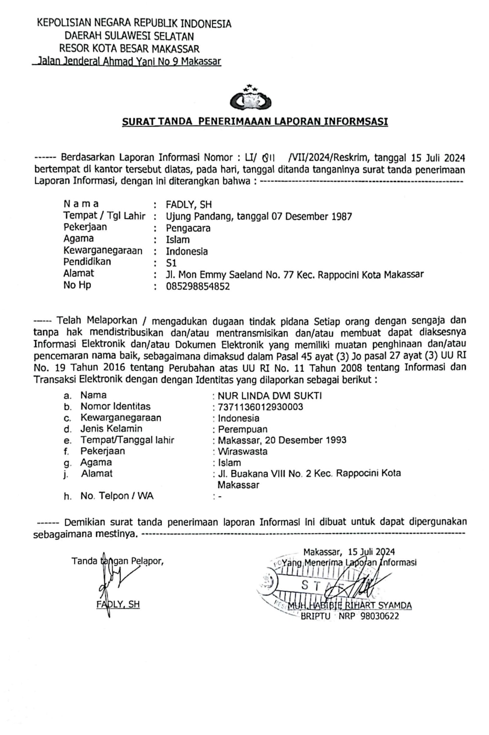 Adapun Laporan Polisi Asmunita Anjas sudah diterima petugas SPKT Polrestabes Makassar dengan No LI/811/VII/2024, tentang dugaan tindak pidana kejahatan informasi dan transaksi elektronik sesuai UU No. 1/2024 sebagai berikut ;