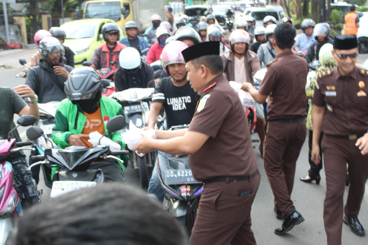 Para pegawai Kejari Gowa bersama anggota IAD tampak antusias turun langsung membagikan takjil kepada pengendara roda dua, roda empat, serta masyarakat sekitar