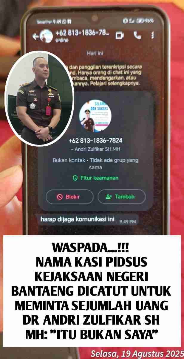 Bantaeng – Menipu dengan mencatut nama pejabat tertentu melalui pesan elektronik (WhatsApp), menjadi modus kejahatan yang sudah sering terdengar, dan kali ini yang dicatut namanya adalah Kepala Seksi Tindak Pidana Khusus pada Kejaksaan Negeri Bantaeng, DR. Andri Zulfikar, S.H., M.H.