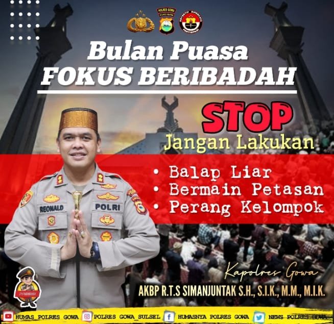 GOWA | JejakKasusNews.Id – Kapolres Gowa AKBP R.T.S Simanjuntak, S.H., S.I.K., M.M., M.I.K mengimbau seluruh masyarakat untuk menjadikan bulan suci Ramadan sebagai momen meningkatkan ibadah dan menjaga ketertiban, Sabtu (08/83/2025).