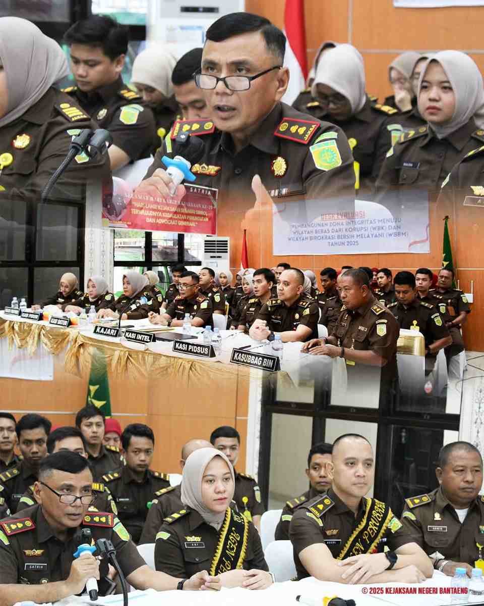 Kepala Kejaksaan Negeri Bantaeng, Satria Abdi, S.H., M.H didampingi KaSi Pidsus DR. Andri Zulfikar, S.H., M.H, KaSi Intelijen Akhmad Putra Dwi, S.H, KaSi Pidum Arfah Tenri Ulan, S.H., M.H, KaSi Datun Puji Astuty, S.H, Plt KaSi PAPBB Harlina SB, S.H dan Kasubbag BIN Andi Arwin Suaib, S.H beserta seluruh jajaran di Kejaksaan Negeri Bantaeng, menghadiri pemaparan Tim Evaluator Kejaksaan Agung Republik Indonesia dalam rangka Desk Evaluasi Pembangunan Zona Integritas (ZI) menuju Wilayah Bebas Korupsi (WBK) dilingkungan Kejaksaan Republik Indonesia Tahun 2025.