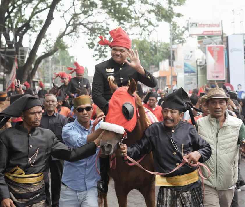 Parade ini dipimpin langsung oleh Bupati Bantaeng, M. Fathul Fauzy Nurdin, yang tampil menunggangi kuda sebagai simbol kekuatan tradisi, selaras dengan tema peringatan tahun ini, “Bangkit Semangat, Deru Tradisi Bantaeng.”
