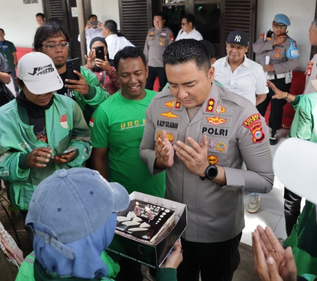 Para pengemudi ojol datang membawa kue ulang tahun sebagai simbol kebersamaan dan bentuk penghormatan kepada Kapolres. Momen hangat itu disambut langsung oleh Kapolres Gowa yang tampak terharu atas kejutan tersebut.