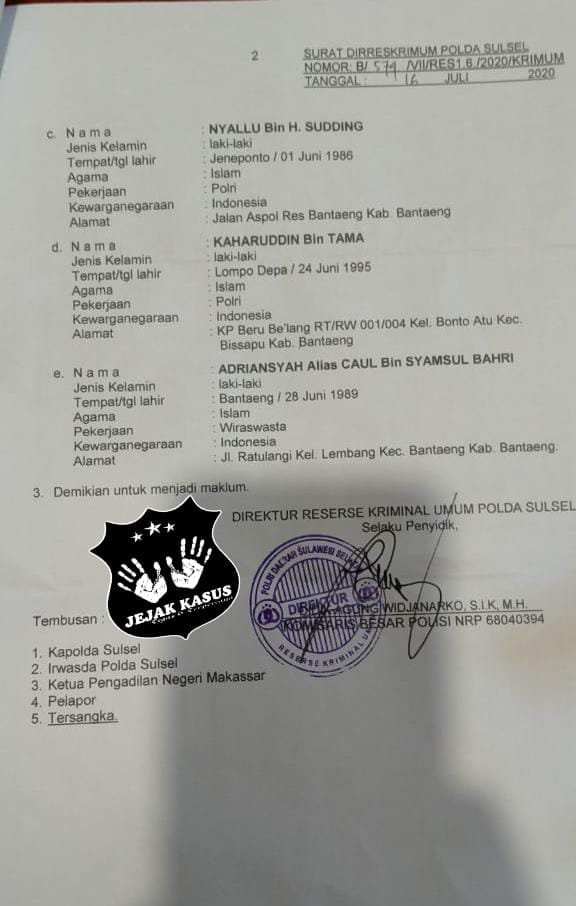 Penetapan status Tersangka ke 4 Polisi Bantaeng tersebut berdasarkan surat dari Direktur Reserse Kriminal Umum Polda Sulawesi Selatan yang di tanda tangani Dirkrimum Polda Sulsel, Kombes Pol Didik Agung Widjanarko yang menjabat pada saat itu kepada Kepala Kejaksaan Tinggi Sulawesi Selatan tertanggal 16 Juli 2020 dengan Nomor: B/574/VII/RES 1.6/2020/KRIMUM, yang mana di surat tersebut jelas tertulis “Perihal: Pemberitahuan Penetapan Tersangka”.