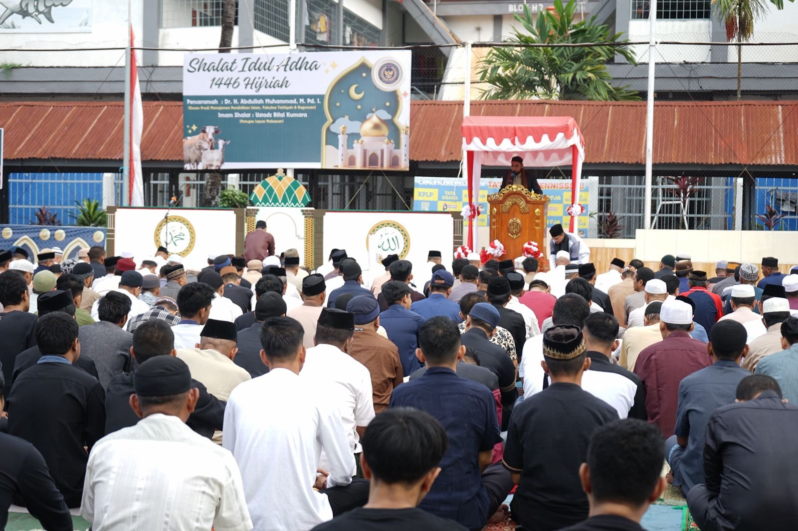 Kegiatan acara sholat idul adha ini dipimpin oleh Bapak Ustadz Dr. H. Abdullah Muhammad, M.Pd.I. selaku Khatib dan Ustadz Rifal Kumara sebagai Imam shalat. Kegiatan yang dilaksanakan di lapangan olahraga dalam Lapas Makassar ini berjalan dengan khusyuk dan khidmat serta berjalan dengan aman dan tertib.