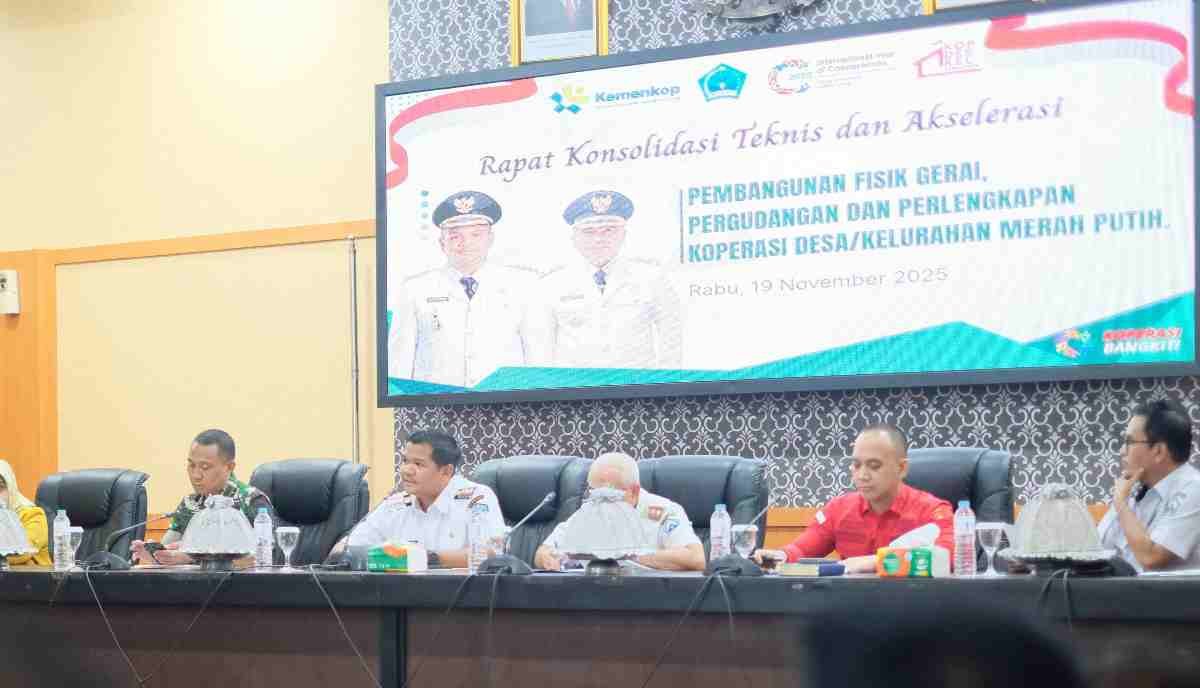 Pemerintah Kabupaten Bantaeng menggelar Rapat Konsolidasi Teknis dan Akselerasi Pembangunan Fisik Gerai, Pergudangan, dan Perlengkapan Koperasi Merah Putih (KMP) Desa dan Kelurahan yang dilaksanakan di Ruang Pola Kantor Bupati Bantaeng. Rabu (19 November 2025).