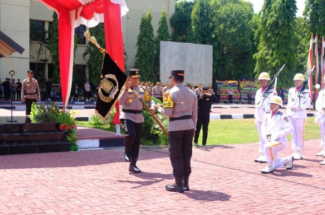 MAKASSAR, JKN.ID – Irjen Pol Andi Rian R Djajadi, S.I.K., M.H.. secara resmi menyerahkan bendera Pataka Kepolisian Daerah (Polda) Sulawesi Selatan Pallawa Lipu kepada Irjen Pol. Yudhiawan S.H., S.I.K., M.H., M.Si.
