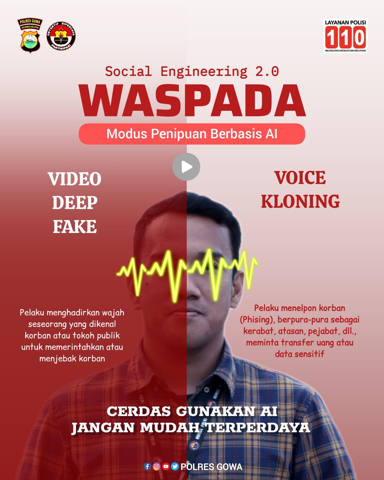 GOWA – Polres Gowa mengimbau masyarakat untuk meningkatkan kewaspadaan terhadap perkembangan modus kejahatan siber terbaru yang dikenal sebagai Social Engineering 2.0, yakni penipuan berbasis kecerdasan buatan (Artificial Intelligence/AI) melalui teknologi video deepfake dan voice cloning, Kamis (01/3/2026).