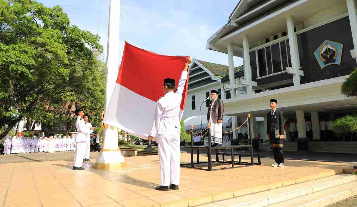 Wakil Bupati Bantaeng, H. Sahabuddin yang bertindak selaku pembina upacara, membacakan sambutan seragam Menteri Agama Republik Indonesia, Prof. H. Nasaruddin Umar.